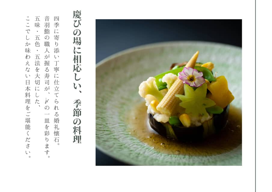 旬の素材を生かした懐石料理の中から数品を特別にご試食いただきながら、おふたりの理想の披露宴をじっくりご相談ください。